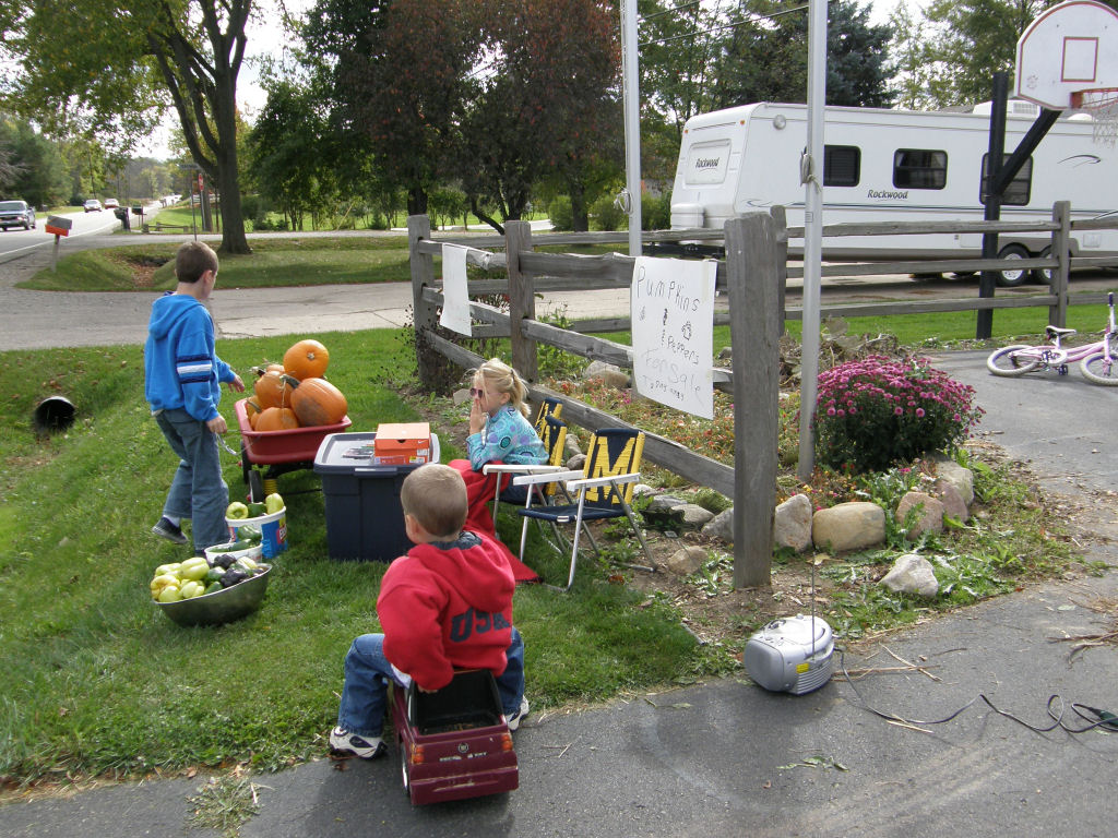 The kids had the day off on Friday for a teacher in-service day, and they decided that they would try to make some money while they were home. They gathered up all of the pumpkins that grew in our yard this year and took them to the road, along with some peppers from our garden, to try and sell. They did have one person stop, but for some reason Tyler sold them a pumpkin for a nickel. Hopefully they will try again and have some better luck... Update (10-14-07): The kids tried once again to sell some pumpkins, and we want to give a special thank-you to our neighbor Bev for stopping by and helping the kids out by buying some pumpkins, as well as some peppers. |
