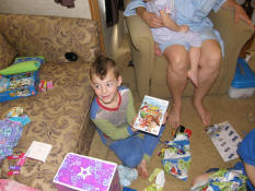 Jayden opened up an new outfit from Grandpa and Grandma.