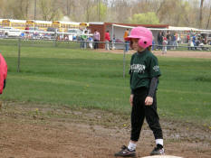 Sam waiting on first base after her first hit of the day.