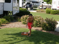 The boys decided to pass the time this morning between meals by playing the washer toss game. Jayden and Drew started out playing, but Jay quickly tired of it and Donovan took her place. Tyler came to watch, but didn't join in on the fun. After lunch the resort had an area with inflatable slides set up for their guests to enjoy. Although Tyler thought the slides were too small to be any fun (they certainly weren't as big as Sun-N-Fun's Hippo Slide) all of the kids wound up having a blast. The kids spent about an hour in the afternoon running between slides and going up and down, in addition to a game of water balloon toss (that didn't go to well for any of us that participated). The kids had so much fun on one of these slides in particular that if I could find it to purchase I would be tempted to do so instead of a getting a swimming pool!
