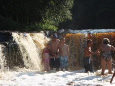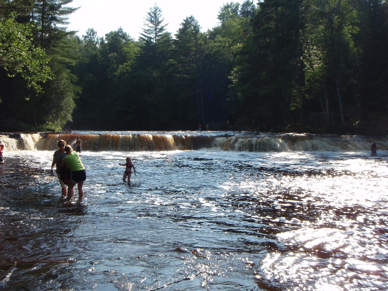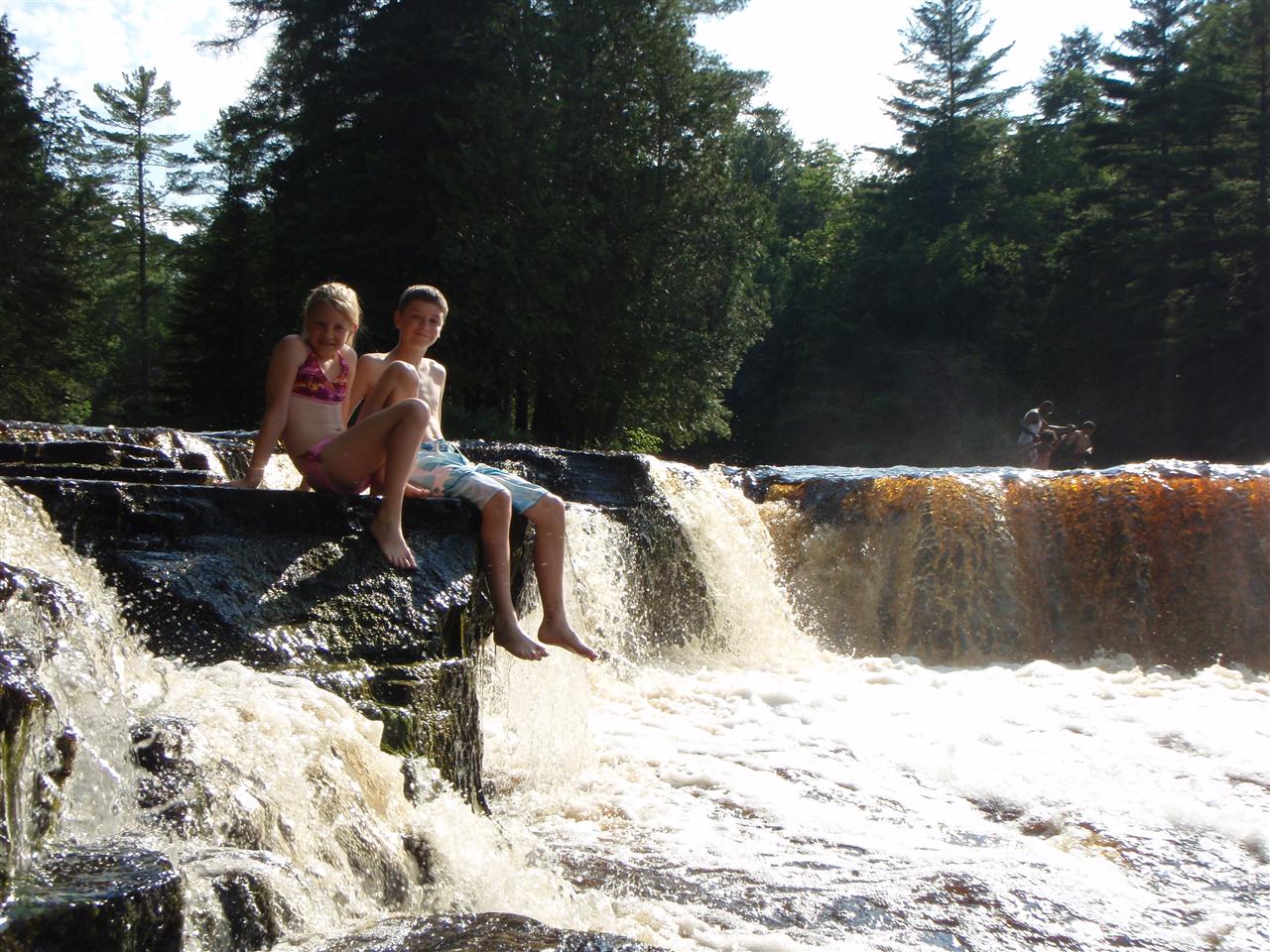 Sam, Rod, and Tyler standing in a taller waterfall.