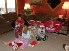 Tyler, Samantha, Drew, and Jayden starting to look through their stockings, filled with gifts from Santa Claus.