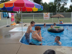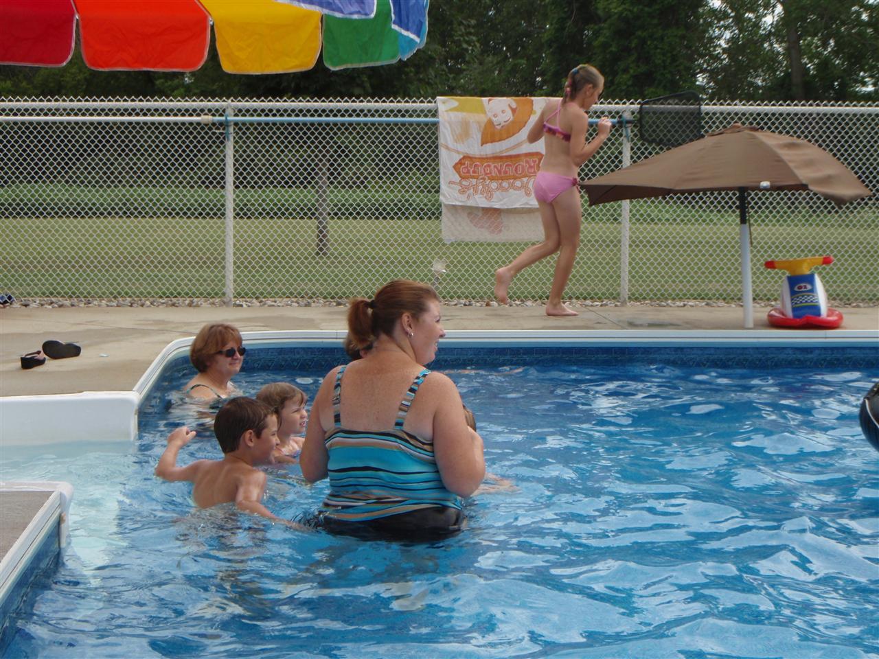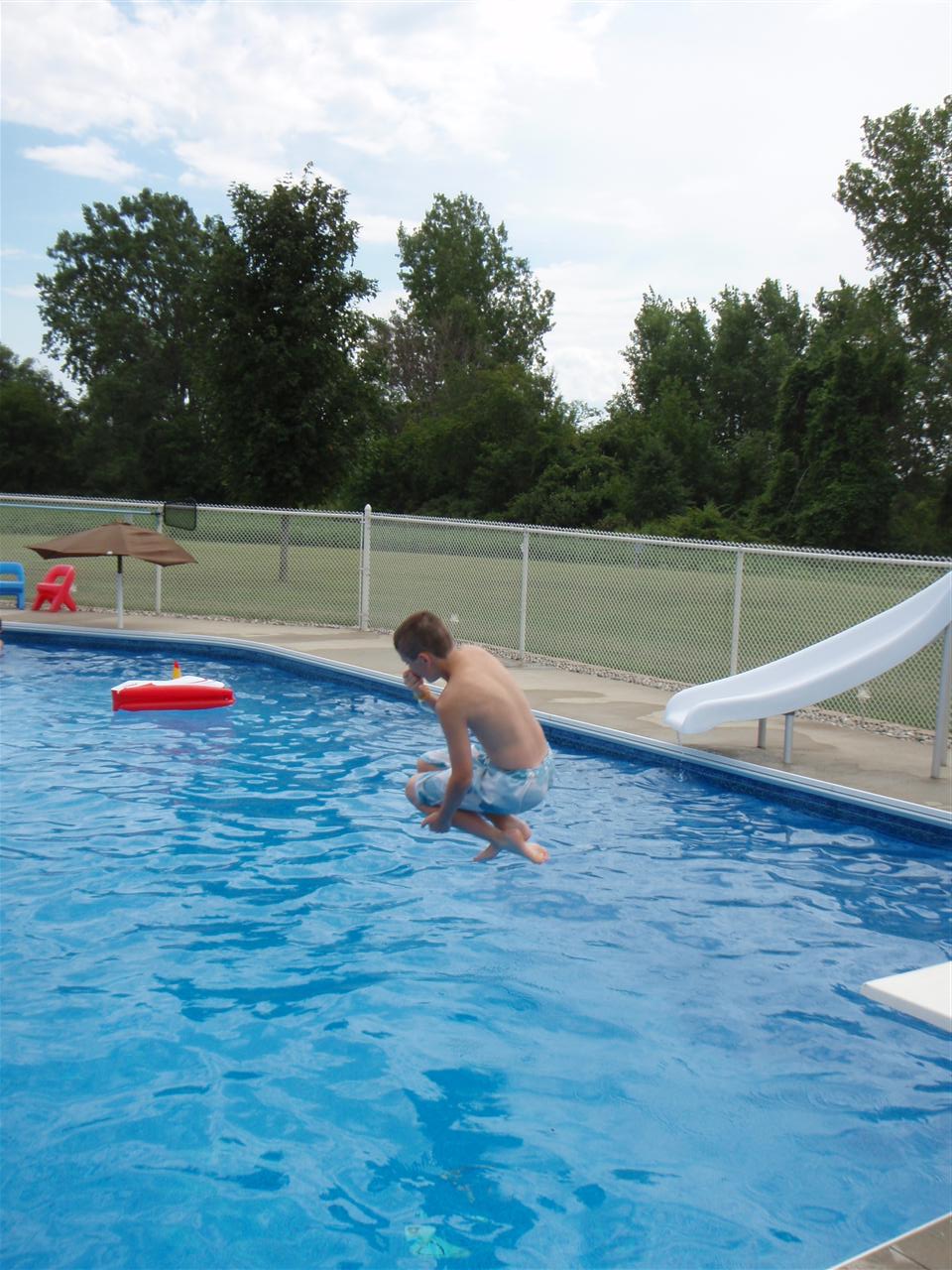 Tyler and Jayden watches as Dozer the dog jumps into the pool.