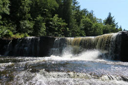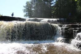 Sam sitting on a rock ledge with the waterfall flowing nearby.