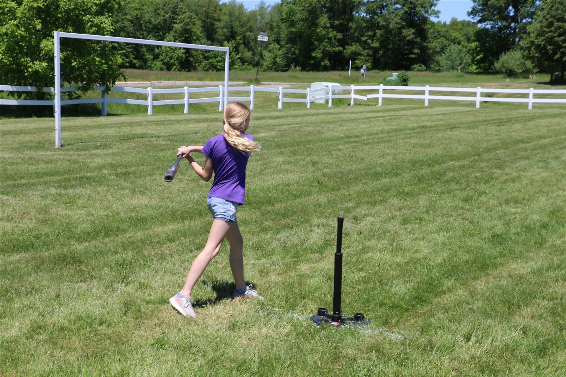 Jay with a big windup on her next try at 'Slap Shot Hockey'...