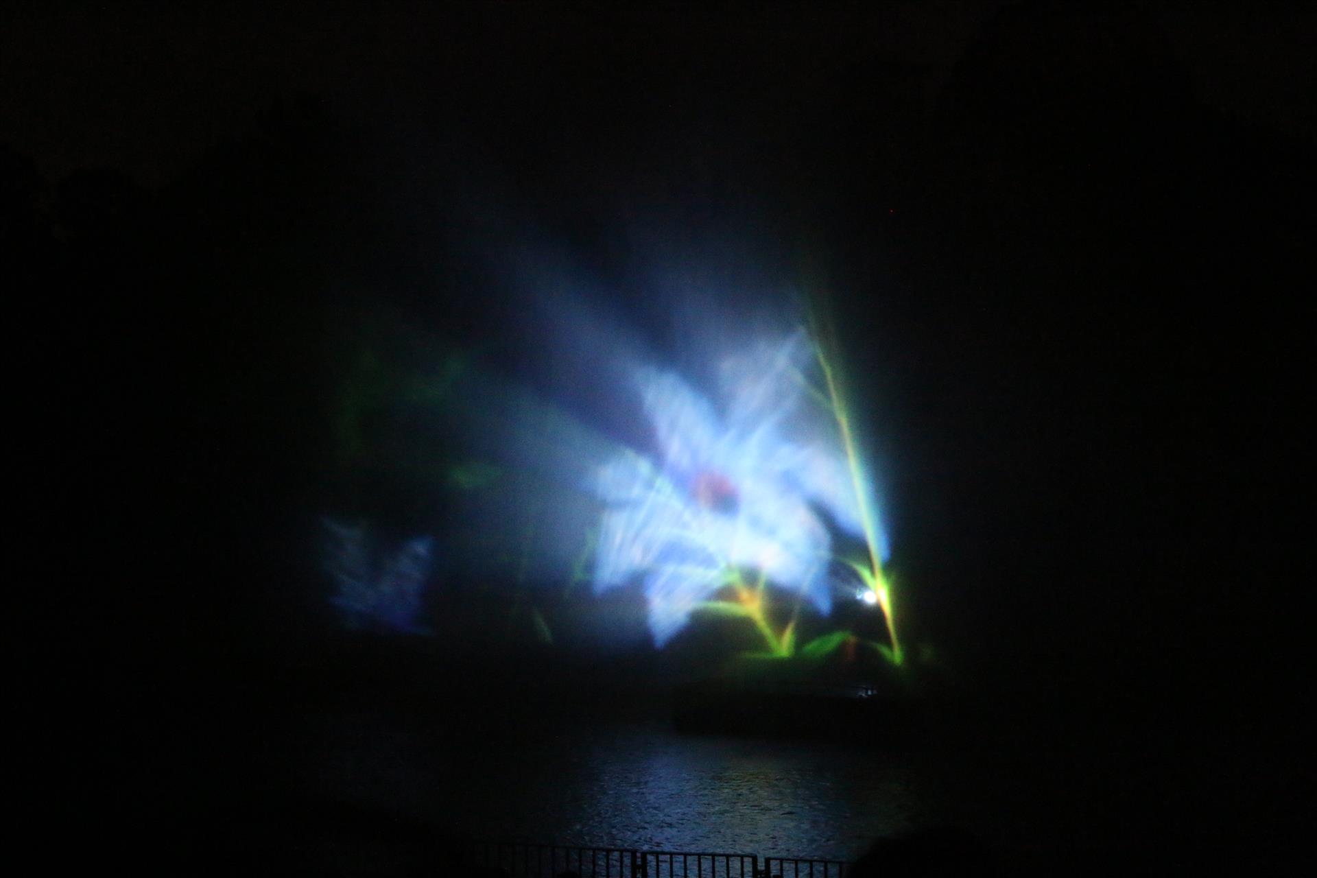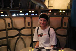 Samantha sitting at the Millennium Falcon's dejarik hologram