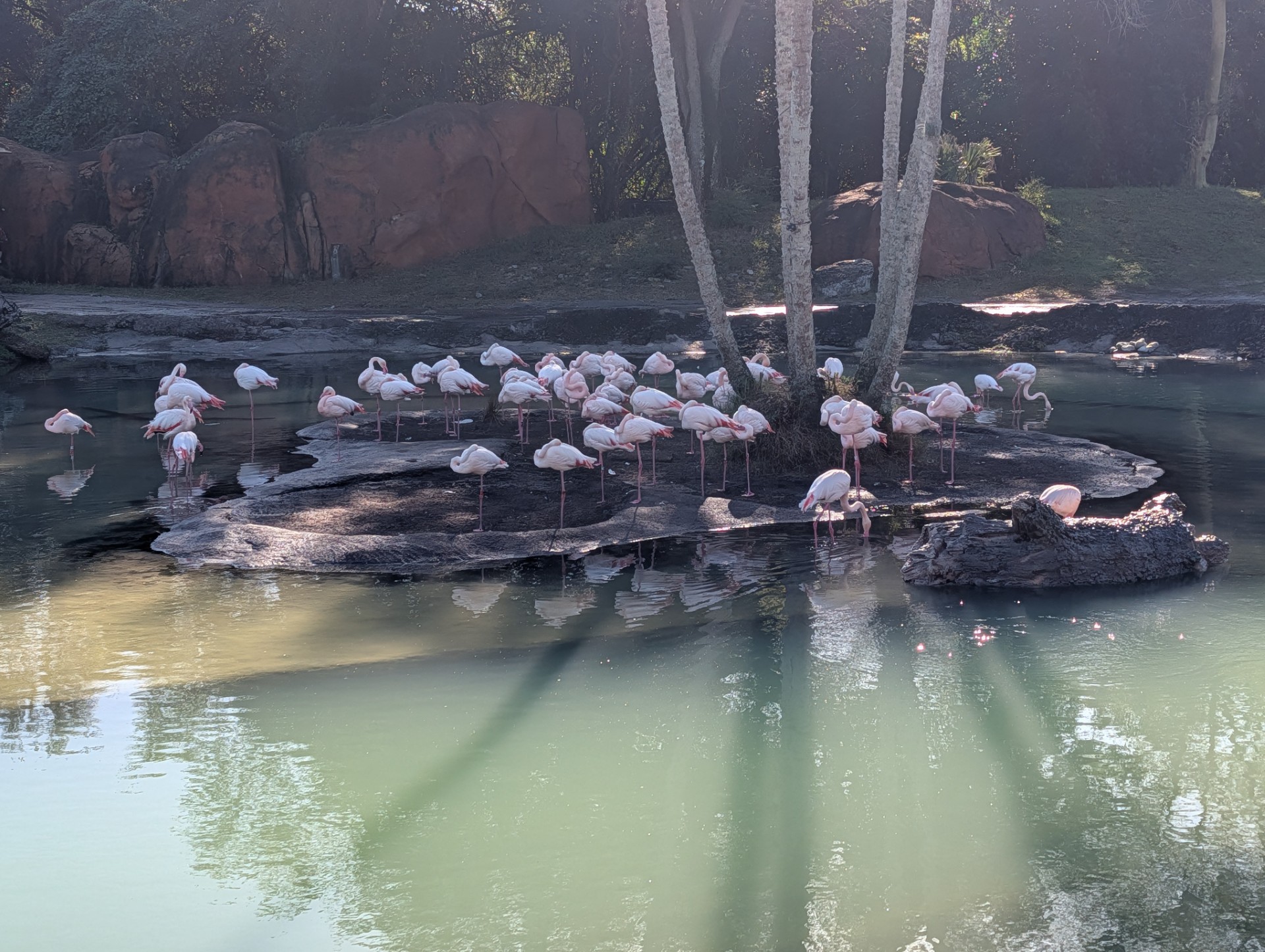 A flamboyance of flamingos on the Mickey Mouse shaped island.